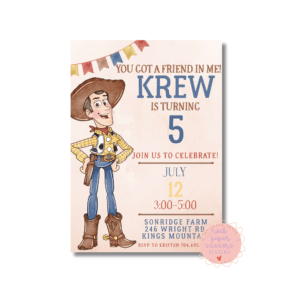 Personalized birthday invitations that measure 5×7 inches printed on 110 lb premium paper and include white envelopes and a solid white back. They are wrapped in a cello bag.