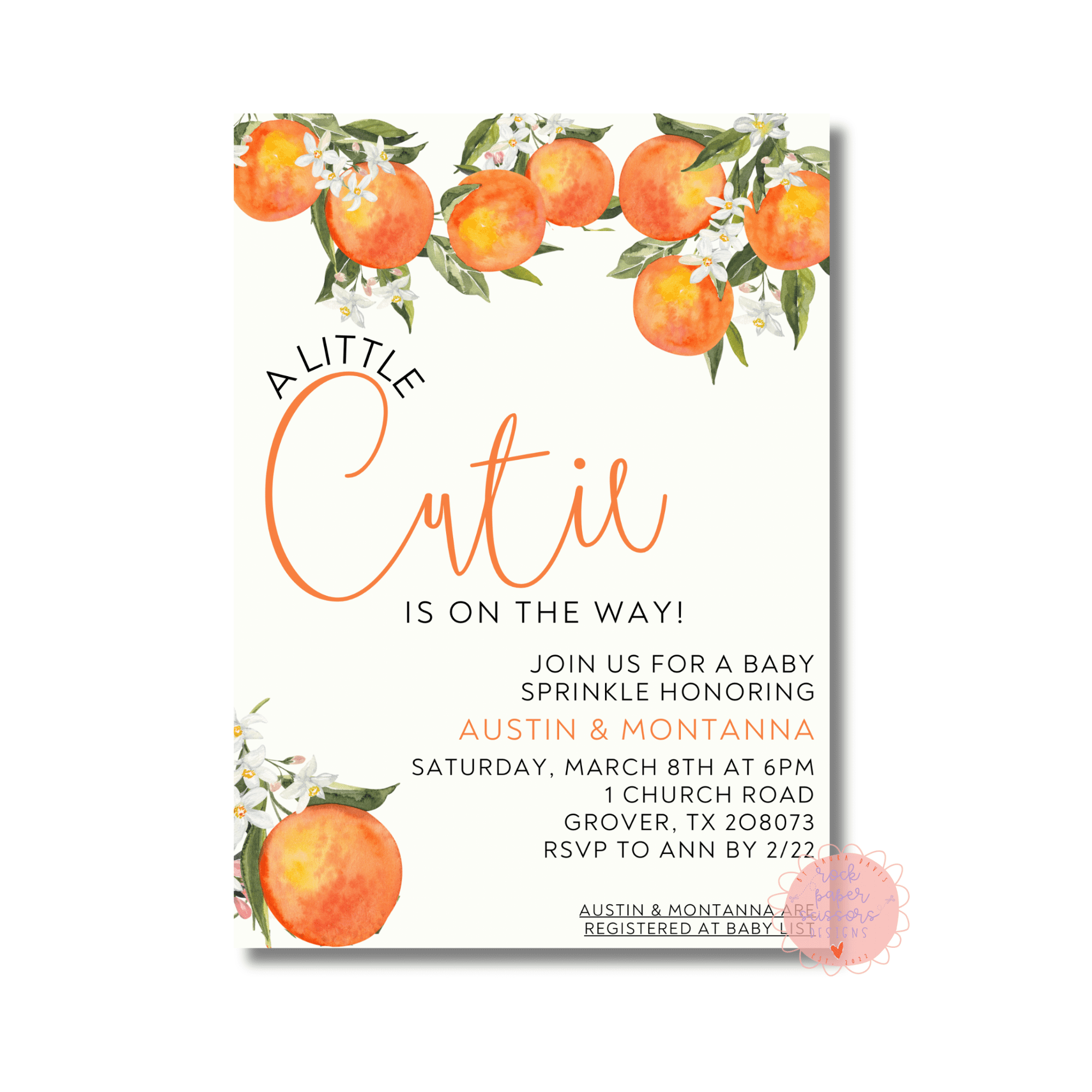 Personalized baby shower invitations that measure 5×7 inches printed on 110 lb premium paper and include white envelopes and a solid white back. They are wrapped in a cello bag.