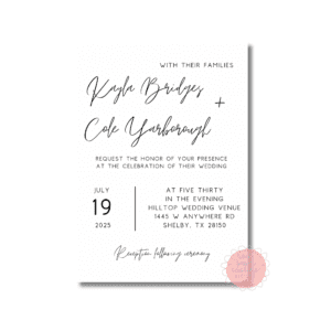 Personalized invitations that measure 5×7 inches printed on 110 lb premium paper and include white envelopes and a solid white back. They are wrapped in a cello bag.
