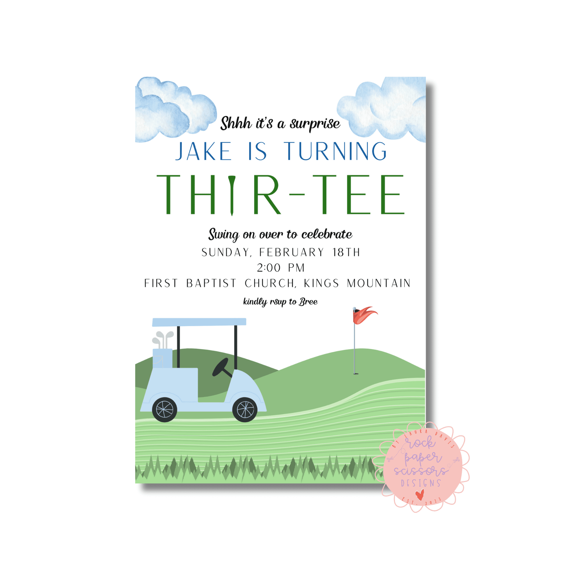 Personalized birthday invitations that measure 5×7 inches printed on 110 lb premium paper and include white envelopes and a solid white back. They are wrapped in a cello bag.