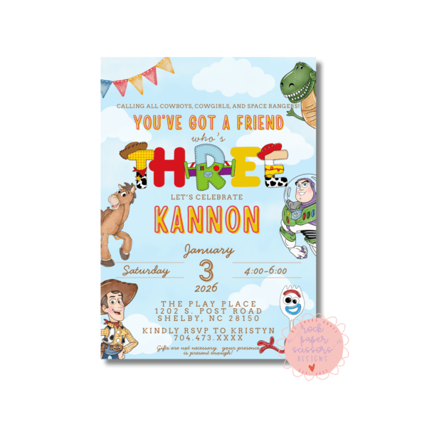 Personalized birthday invitations that measure 5×7 inches printed on 110 lb premium paper and include white envelopes and a solid white back. They are wrapped in a cello bag.