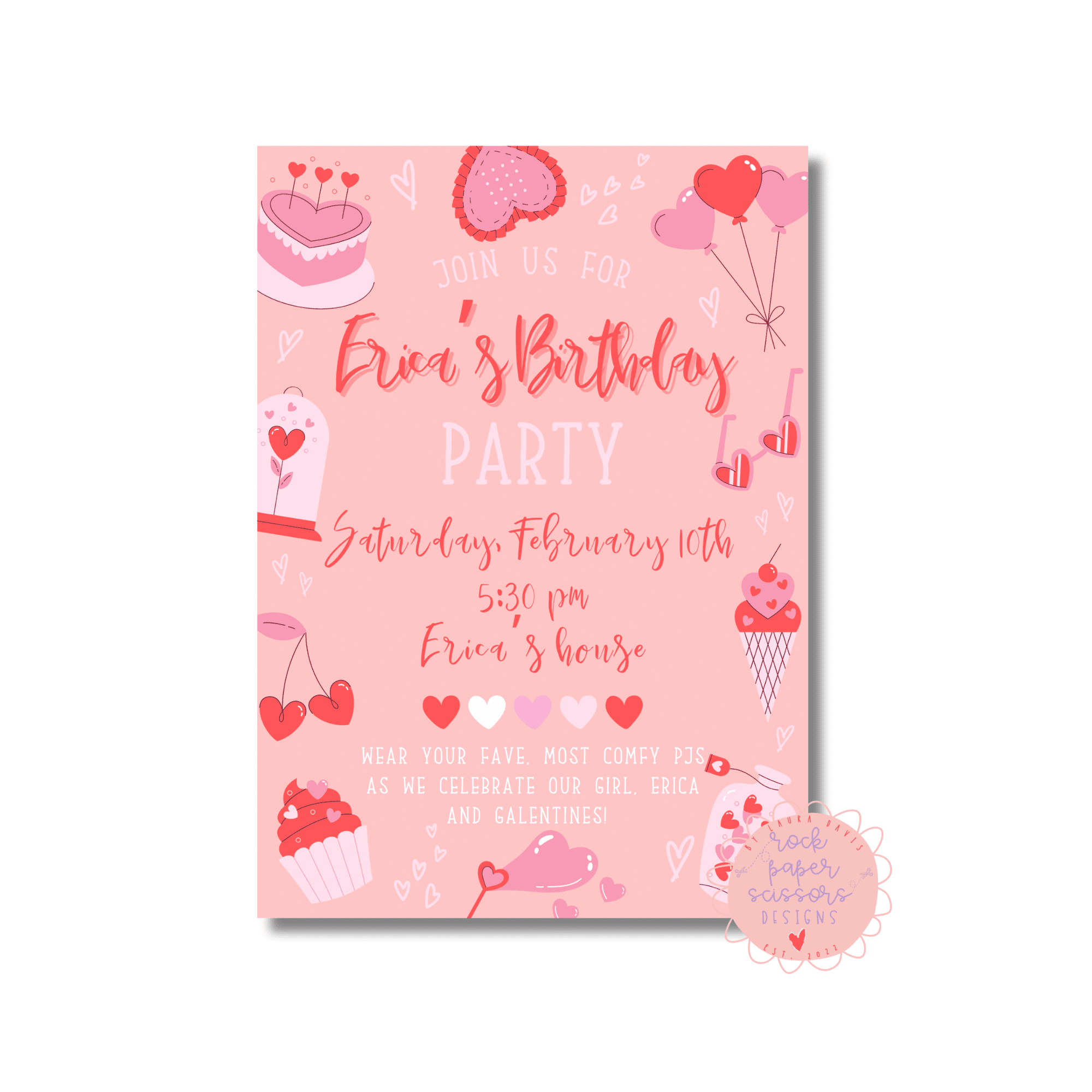 Personalized birthday invitations that measure 5×7 inches printed on 110 lb premium paper and include white envelopes and a solid white back. They are wrapped in a cello bag.